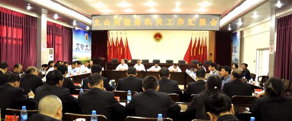 调研组参观了州中级人民法院诉讼服务中心、各部门办公室和州人民检察院远程视频接访大厅、办案工作区、预防职务犯罪警示教育厅、荣誉厅、文化长廊等,并在“两院”分别召开座谈会听取工作情况汇报。徐爱民对州“两院”卓有成效的工作,为全面推进依法治州、加快建设法治文山、深化改革跨越发展提供有力的司法保障,给予充分肯定,对州“两院”在州委的领导下,自觉和主动接受州人大及其常委会的监督表示满意。徐爱民要求,州“两院”要坚持党的领导,做到讲政治、懂规矩、守纪律,与党中央、省委、州委保持高度一致;要坚决执行宪法和法律,严格依法依程序办事;要落实好习近平总书记提出的“让民众在每个司法案件中都感到公平正义”要求,公正司法,维护正义;要高度重视司法改革,提前调研,及早准备,支持改革,适应改革,稳定队伍,安定人心;要加强队伍建设,提高法院、检察院队伍整体素质,加强反腐倡廉建设,以廉洁司法保证公正司法;要继续发扬优良传统,自觉主动接受人大及其常委会的监督。