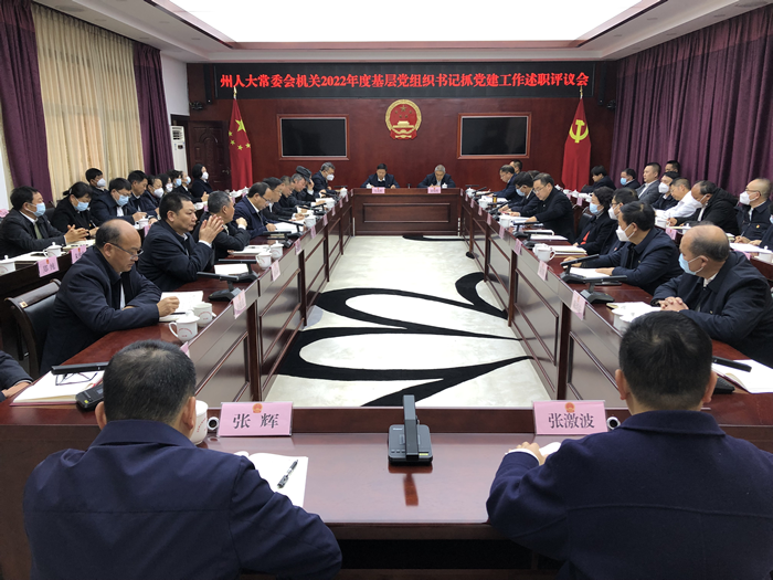 2月3日,州人大常委会机关召开2022年度基层党组织书记抓党建工作述职评议会。机关在职全体党员和离退休党员代表共59人参加会议。 州人大常委会党组书记、主任王毅,党组副书记、副主任赵琼,党组成员、副主任李献文、刘扬,保留副厅长级待遇干部李洁、陶开晖以普通党员身份参加了会议。