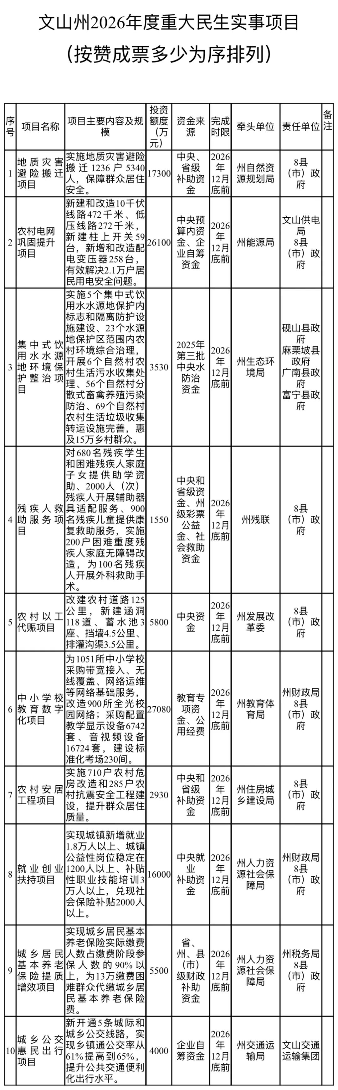 文山壮族苗族自治州第十五届人民代表大会第六次会议票决出2026年度10件重大民生实事项目。