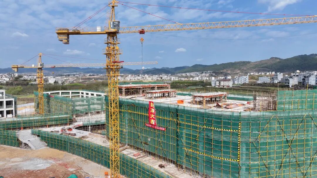 站在工地入口望去,几栋已顺利封顶的综合楼与教学楼主体结构巍然矗立。工人们分散在各个作业面,有条不紊地开展墙体砌筑、墙面贴砖等后续工序,每一道工序都精益求精,每一个身影都干劲十足。