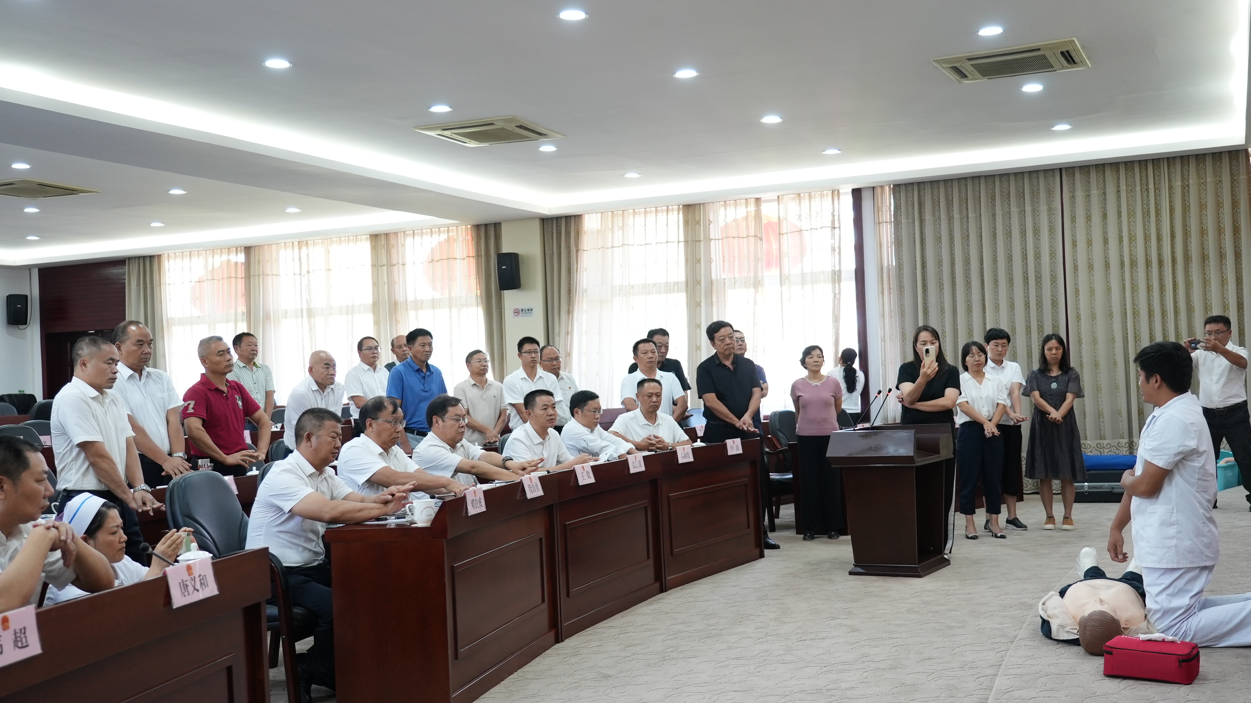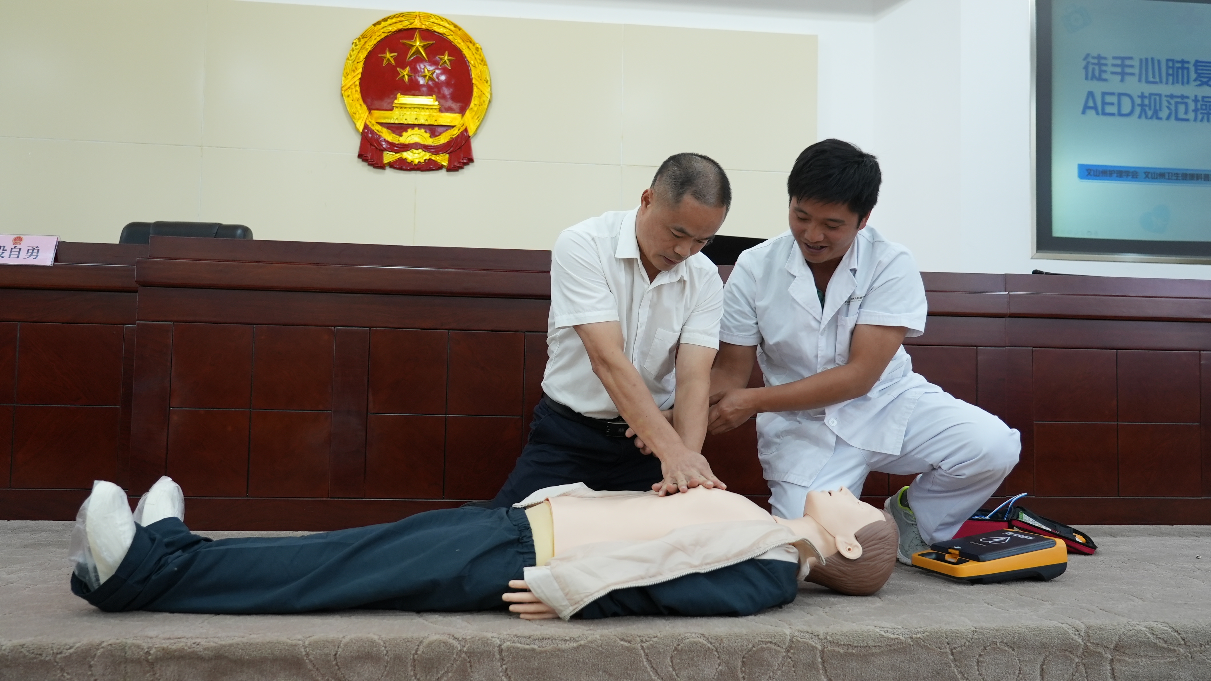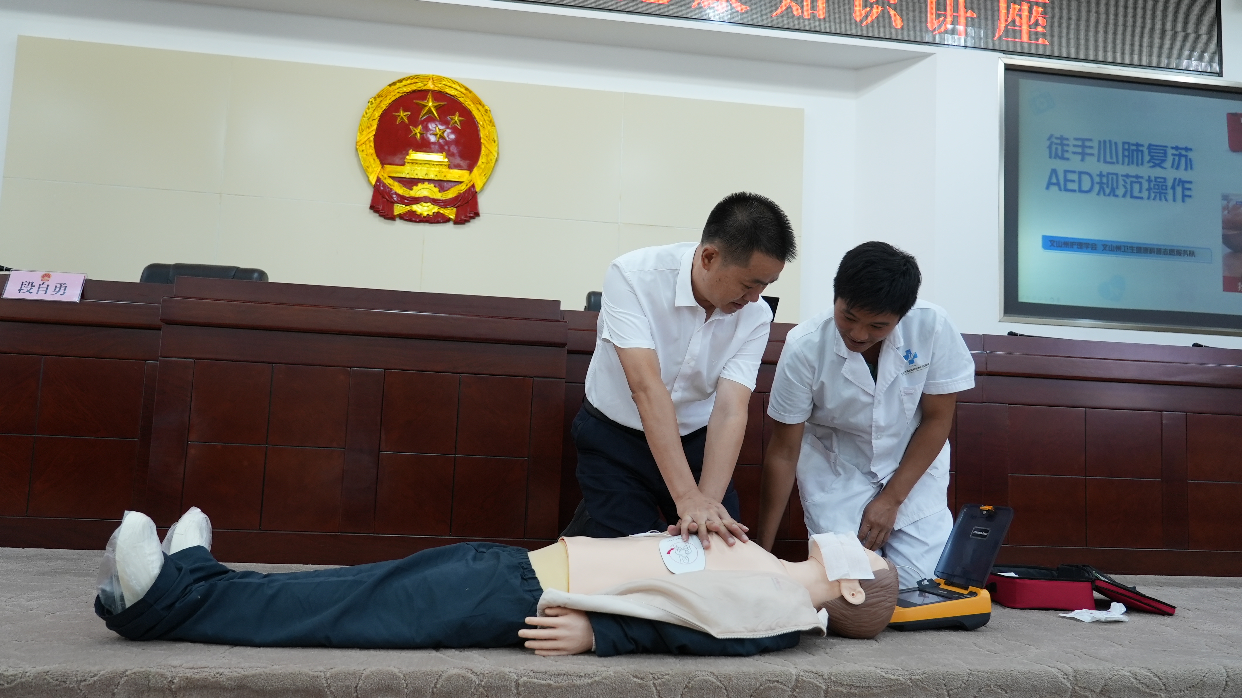 “什么是高血压?”“高血压有什么症状?”围绕一系列问题,龙梅结合自身多年丰富经验,围绕慢性疾病防治,用深入浅出的语言介绍了高血压、痛风等疾病形成原因、预防措施等,有针对性地教大家如何辨别和自我筛查病症,同时呼吁大家要做到关注自身健康,定期体检,及时发现潜在的致病危险因素,积极进行干预,早发现、早诊断、早治疗。此外,医护人员还对干部职工进行海姆立克急救法、徒手心肺复苏、AED规范操作进行了培训。
